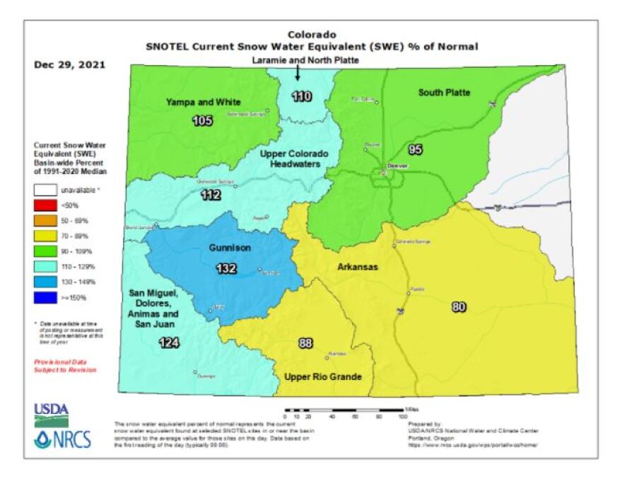 At the start of the month, snowpack in Colorado’s southwestern mountains was dire — the San Juan basin in southwestern Colorado was at a 35% average snowpack. But storms last week helped boost levels to significantly above average for December in many parts of the state, according to the Colorado Climate Center.
